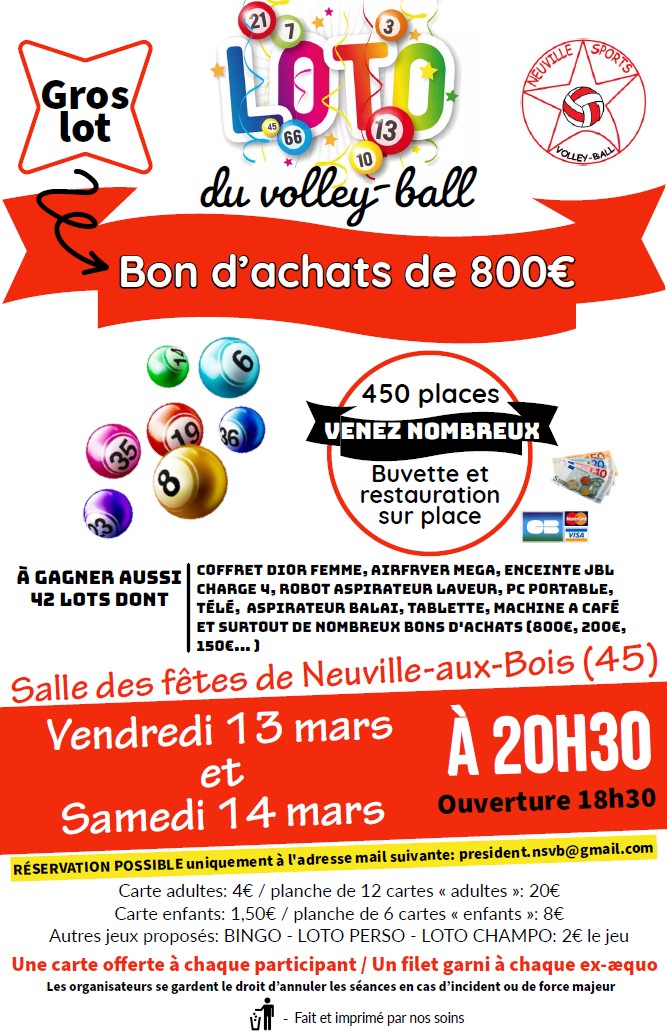 Le Neuville Sports Volley-Ball organise son loto : Vendredi 13 mars &...