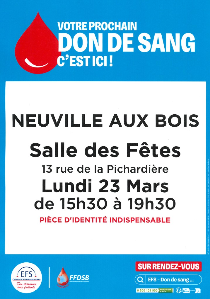 Une collecte de sang se tiendra le : lundi 23 mars...
