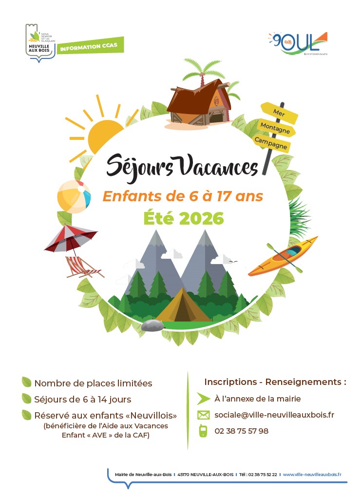 Le CCAS de Neuville-aux-Bois propose des séjours vacances pour les enfants de 6 à 17 ans :